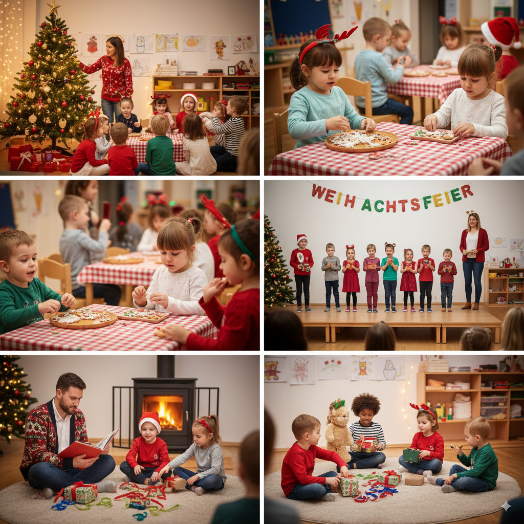 Am [Datum einsetzen] haben wir gemeinsam mit den Kindern, Eltern und Erzieherinnen eine fröhliche Weihnachtsfeier in unserem Kindergarten erlebt. Schon am Nachmittag lag festliche Stimmung in der Luft: Der Duft von Plätzchen und Kinderpunsch zog durch die Räume, überall funkelten Lichterketten und die Kinder waren voller Vorfreude.